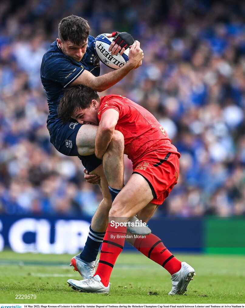 14 May 2022; Hugo Keenan of Leinster is tackled by Antoine Dupont of Toulouse during the Heineken Champions Cup Semi-Final match between Leinster and Toulouse at Aviva Stadium in Dublin. Photo by Brendan Moran/Sportsfile