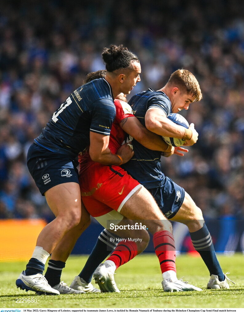 14 May 2022; Garry Ringrose of Leinster, supported by teammate James Lowe, is tackled by Romain Ntamack of Toulouse during the Heineken Champions Cup Semi-Final match between Leinster and Toulouse at the Aviva Stadium in Dublin. Photo by Harry Murphy/Sportsfile