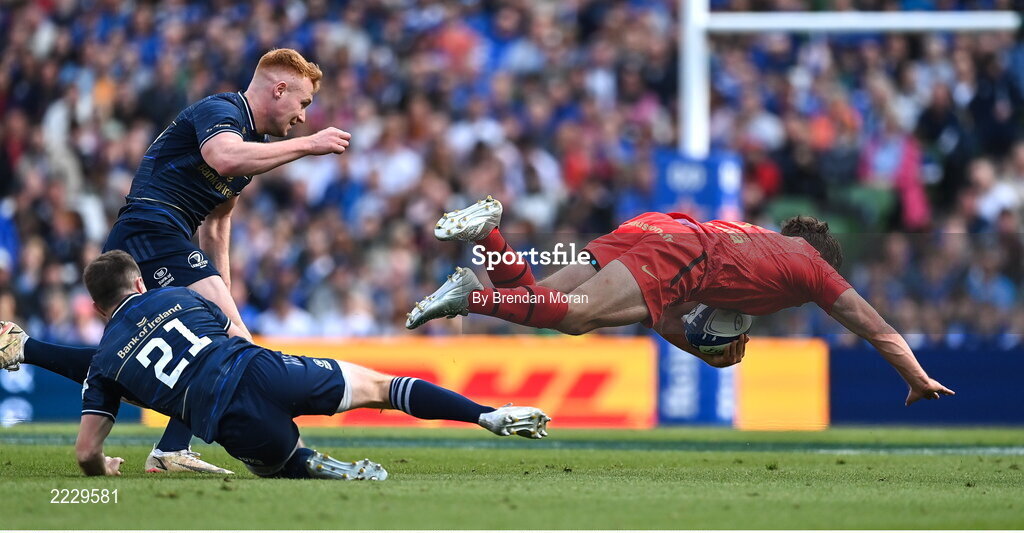 14 May 2022; Antoine Dupont of Toulouse is tackled by Luke McGrath and Ciarán Frawley of Leinster during the Heineken Champions Cup Semi-Final match between Leinster and Toulouse at Aviva Stadium in Dublin. Photo by Brendan Moran/Sportsfile