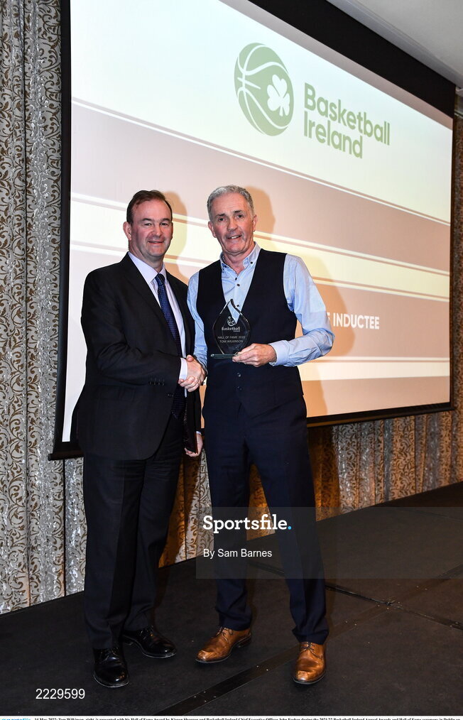 14 May 2022; Tom Wilkinson, right, is presented with his Hall of Fame Award by Kieran Shannon and Basketball Ireland Chief Executive Officer John Feehan during the 2021/22 Basketball Ireland Annual Awards and Hall of Fame ceremony in Dublin on Saturday at Royal Marine Hotel in Dun Laoghaire, Dublin. Photo by Sam Barnes/Sportsfile