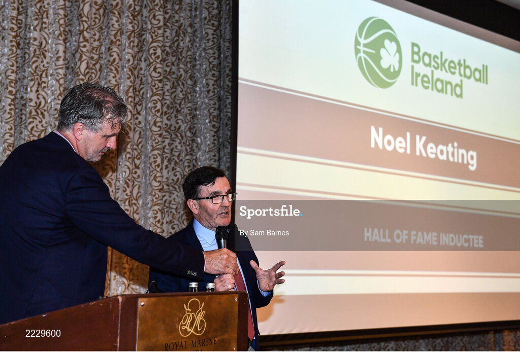 14 May 2022; Noel Keating, right, speaking with Master of Ceremonies John Irwin during the 2021/22 Basketball Ireland Annual Awards and Hall of Fame ceremony in Dublin on Saturday at Royal Marine Hotel in Dun Laoghaire, Dublin. Photo by Sam Barnes/Sportsfile