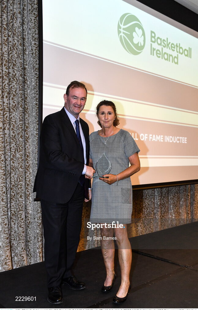 14 May 2022; Caroline Forde is presented with her Hall of Fame Award by Basketball Ireland Chief Executive Officer John Feehan during the 2021/22 Basketball Ireland Annual Awards and Hall of Fame ceremony in Dublin on Saturday at Royal Marine Hotel in Dun Laoghaire, Dublin. Photo by Sam Barnes/Sportsfile