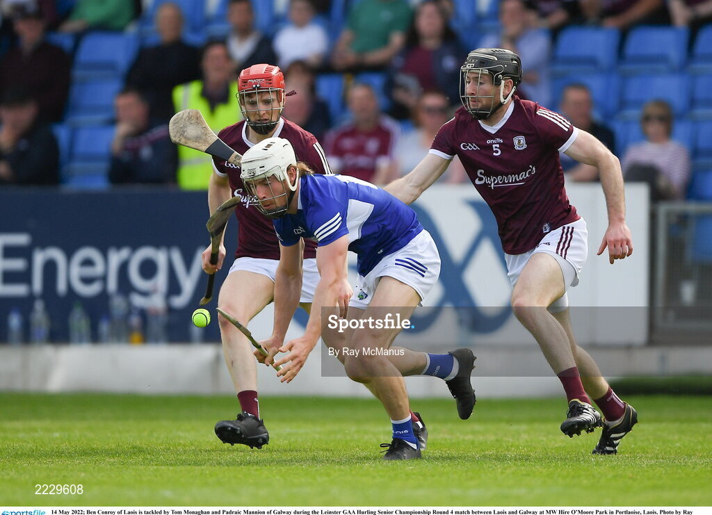 14 May 2022; Ben Conroy of Laois is tackled by Tom Monaghan and Padraic Mannion of Galway during the Leinster GAA Hurling Senior Championship Round 4 match between Laois and Galway at MW Hire O’Moore Park in Portlaoise, Laois. Photo by Ray McManus/Sportsfile