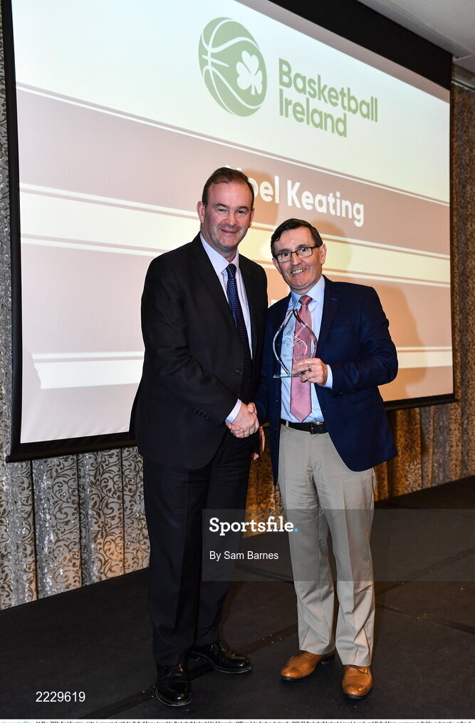 14 May 2022; Noel Keating, right, is presented with his Hall of Fame Award by Basketball Ireland Chief Executive Officer John Feehan during the 2021/22 Basketball Ireland Annual Awards and Hall of Fame ceremony in Dublin on Saturday at Royal Marine Hotel in Dun Laoghaire, Dublin. Photo by Sam Barnes/Sportsfile