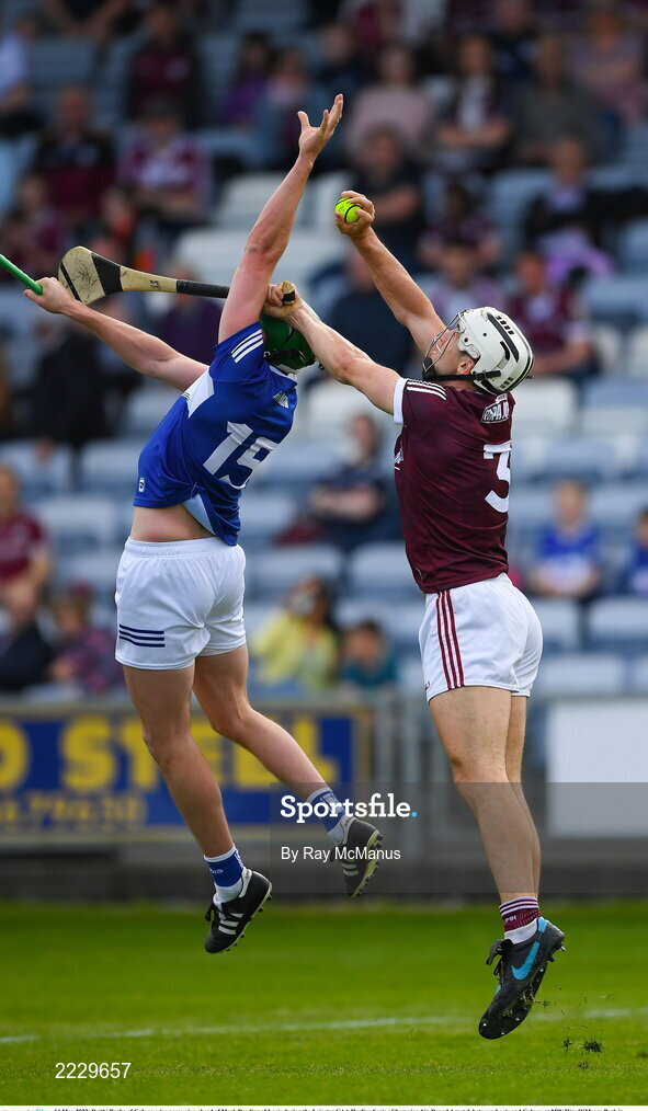14 May 2022; Daithí Burke of Galway wins possession ahead of Mark Dowling of Laois during the Leinster GAA Hurling Senior Championship Round 4 match between Laois and Galway at MW Hire O’Moore Park in Portlaoise, Laois. Photo by Ray McManus/Sportsfile