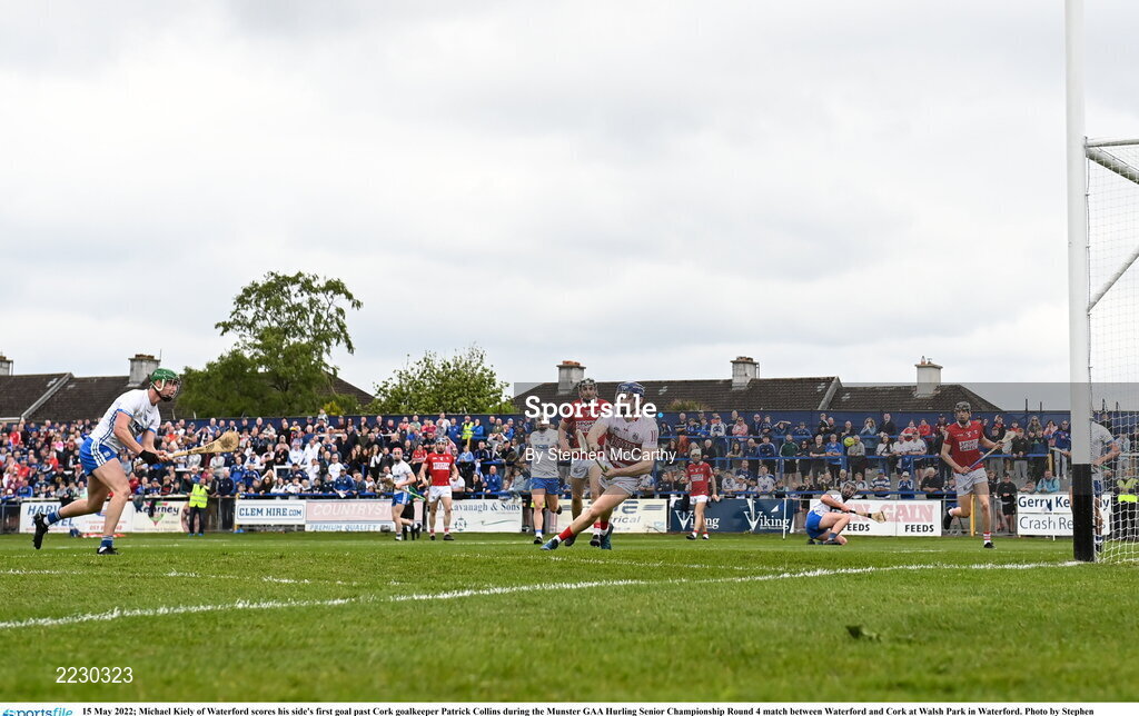 15 May 2022; Michael Kiely of Waterford scores his side's first goal past Cork goalkeeper Patrick Collins during the Munster GAA Hurling Senior Championship Round 4 match between Waterford and Cork at Walsh Park in Waterford. Photo by Stephen McCarthy/Sportsfile