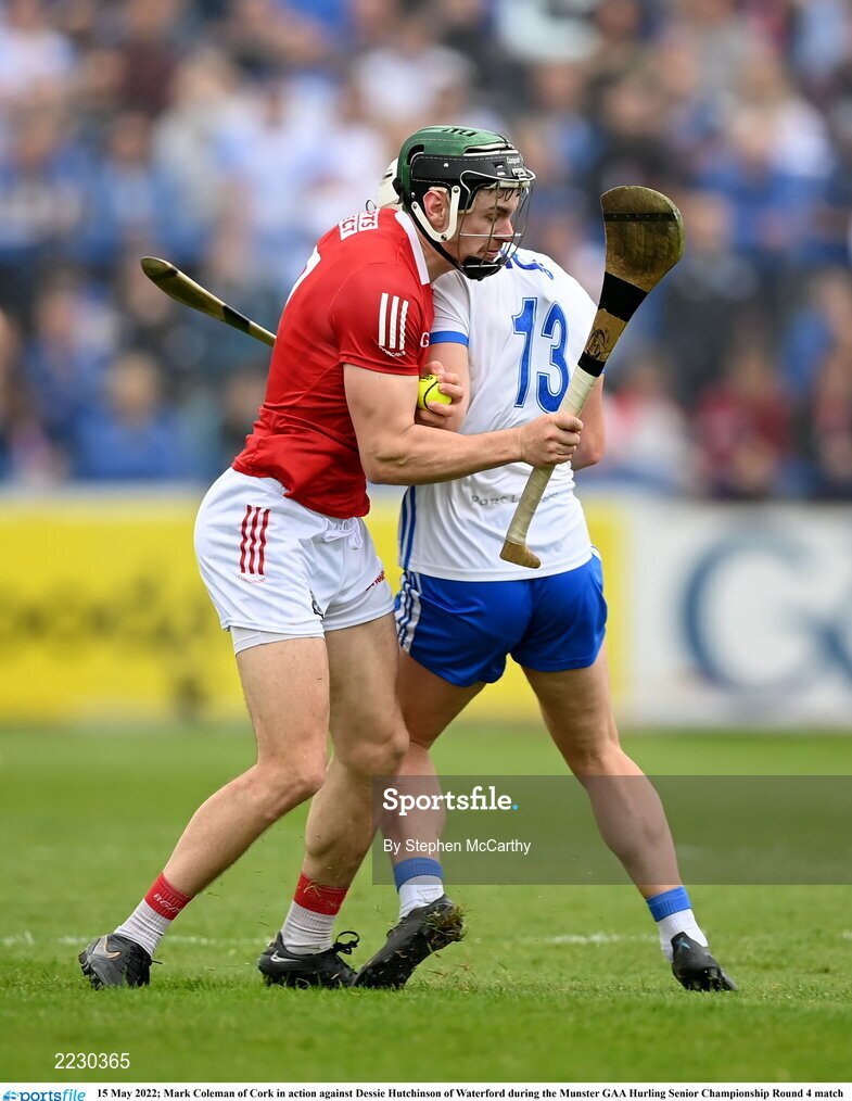 15 May 2022; Mark Coleman of Cork in action against Dessie Hutchinson of Waterford during the Munster GAA Hurling Senior Championship Round 4 match between Waterford and Cork at Walsh Park in Waterford. Photo by Stephen McCarthy/Sportsfile