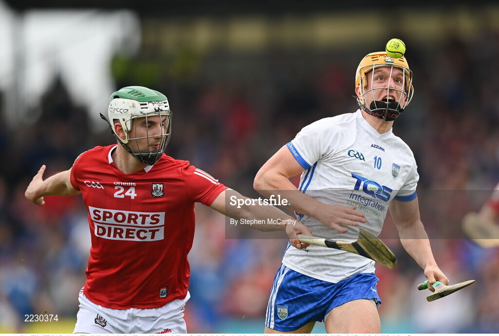 15 May 2022; Jack Prendergast of Waterford in action against Shane Kingston of Cork during the Munster GAA Hurling Senior Championship Round 4 match between Waterford and Cork at Walsh Park in Waterford. Photo by Stephen McCarthy/Sportsfile