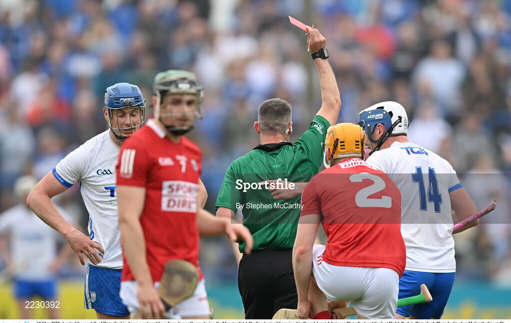 15 May 2022; Austin Gleeson, left, of Waterford is shown a red card by referee James Owens during the Munster GAA Hurling Senior Championship Round 4 match between Waterford and Cork at Walsh Park in Waterford. Photo by Stephen McCarthy/Sportsfile