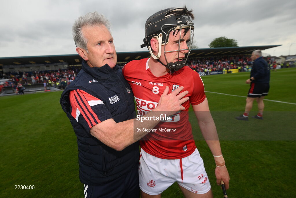 15 May 2022; Cork manager Kieran Kingston celebrates with Darragh Fitzgibbon after the Munster GAA Hurling Senior Championship Round 4 match between Waterford and Cork at Walsh Park in Waterford. Photo by Stephen McCarthy/Sportsfile