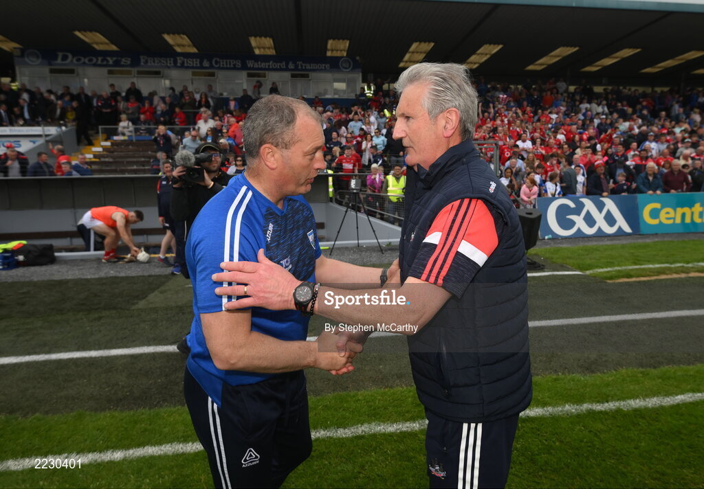 15 May 2022; Waterford manager Liam Cahill and Cork manager Kieran Kingston after the Munster GAA Hurling Senior Championship Round 4 match between Waterford and Cork at Walsh Park in Waterford. Photo by Stephen McCarthy/Sportsfile