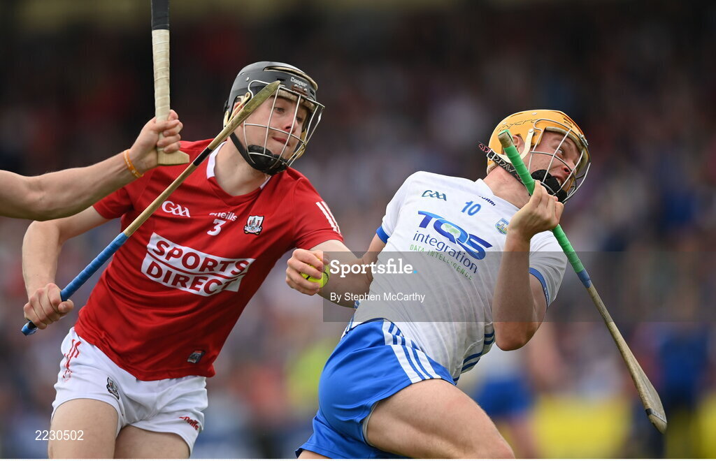 15 May 2022; Jack Prendergast of Waterford in action against Robert Downey of Cork during the Munster GAA Hurling Senior Championship Round 4 match between Waterford and Cork at Walsh Park in Waterford. Photo by Stephen McCarthy/Sportsfile