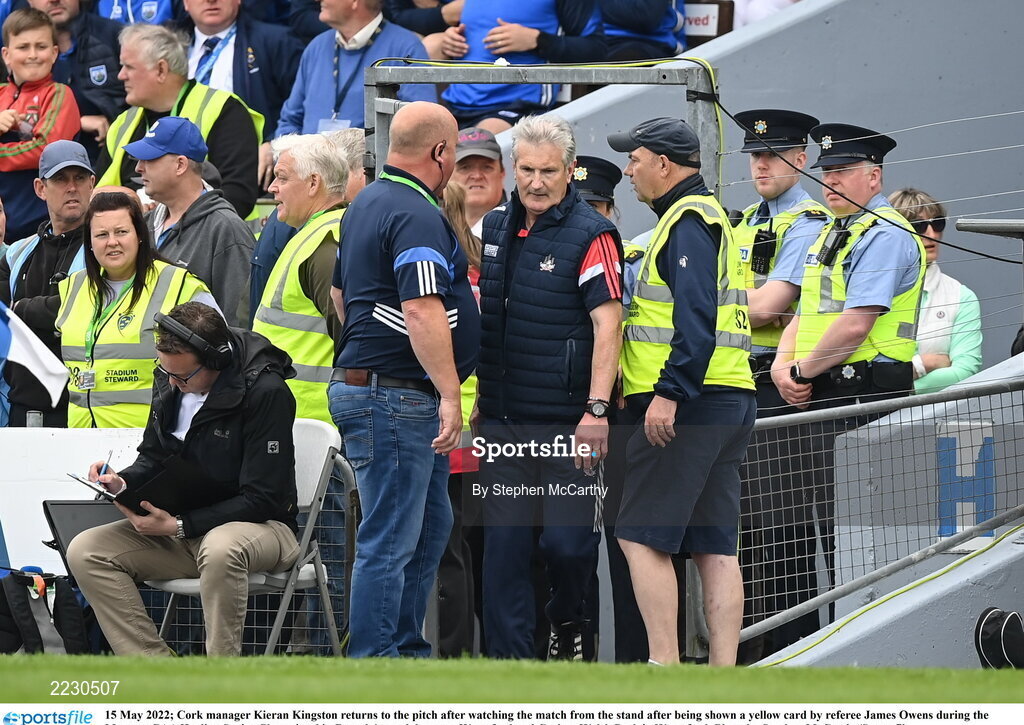 15 May 2022; Cork manager Kieran Kingston returns to the pitch after watching the match from the stand after being shown a yellow card by referee James Owens during the Munster GAA Hurling Senior Championship Round 4 match between Waterford and Cork at Walsh Park in Waterford. Photo by Stephen McCarthy/Sportsfile