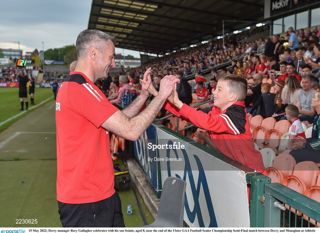 15 May 2022; Derry manager Rory Gallagher celebrates with his son Seánie, aged 8, near the end of the Ulster GAA Football Senior Championship Semi-Final match between Derry and Monaghan at Athletic Grounds in Armagh. Photo by Daire Brennan/Sportsfile