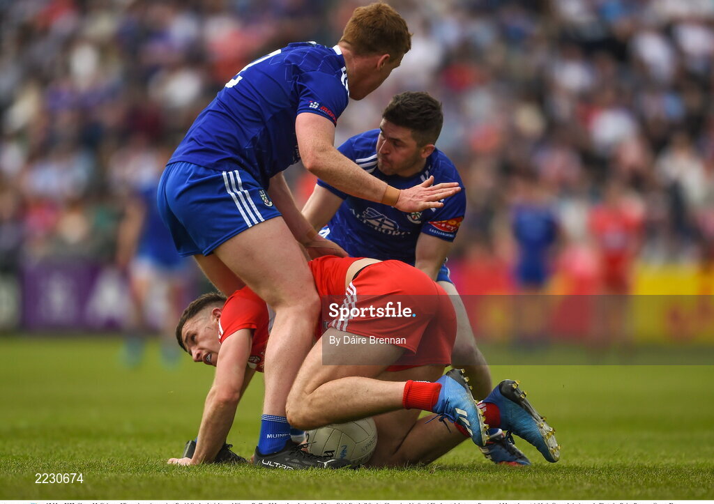 15 May 2022; Shane McGuigan of Derry in action against David Garland, right, and Kieran Duffy of Monaghan during the Ulster GAA Football Senior Championship Semi-Final match between Derry and Monaghan at Athletic Grounds in Armagh. Photo by Daire Brennan/Sportsfile