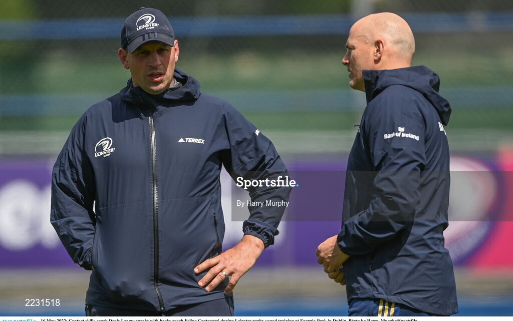 16 May 2022; Contact skills coach Denis Leamy speaks with backs coach Felipe Contepomi during Leinster rugby squad training at Energia Park in Dublin. Photo by Harry Murphy/Sportsfile