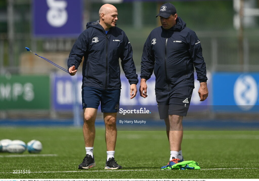 16 May 2022; Backs coach Felipe Contepomi speaks with contact skills coach Denis Leamy during Leinster rugby squad training at Energia Park in Dublin. Photo by Harry Murphy/Sportsfile