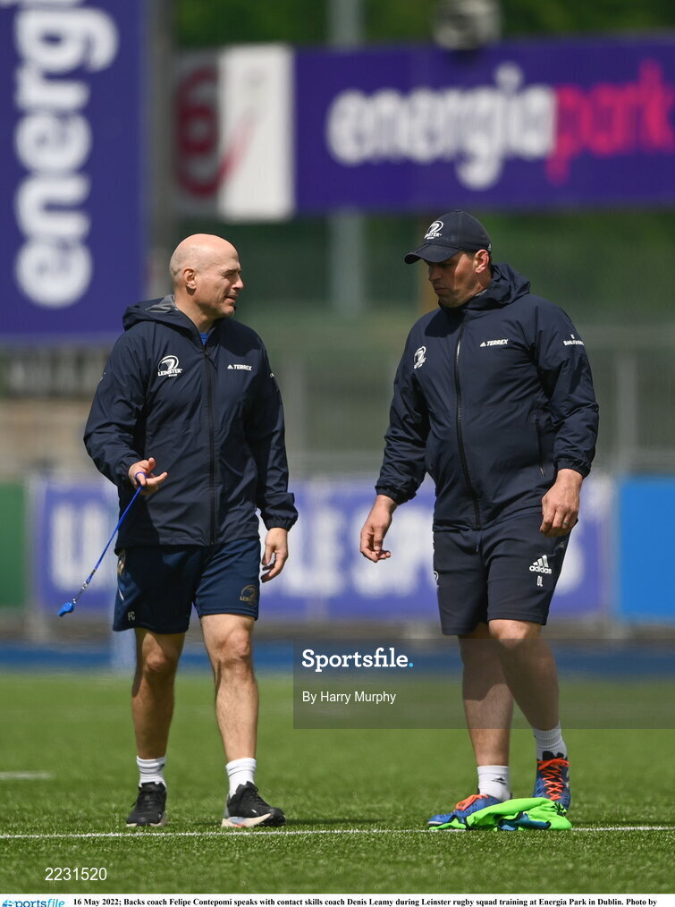 16 May 2022; Backs coach Felipe Contepomi speaks with contact skills coach Denis Leamy during Leinster rugby squad training at Energia Park in Dublin. Photo by Harry Murphy/Sportsfile