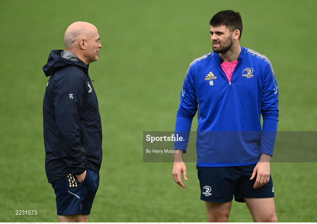 16 May 2022; Harry Byrne speaks with backs coach Felipe Contepomi during Leinster rugby squad training at Energia Park in Dublin. Photo by Harry Murphy/Sportsfile