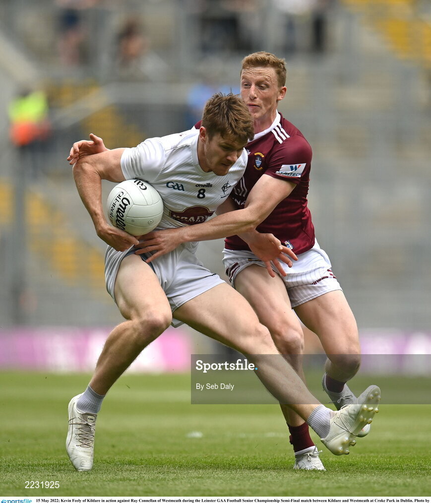15 May 2022; Kevin Feely of Kildare in action against Ray Connellan of Westmeath during the Leinster GAA Football Senior Championship Semi-Final match between Kildare and Westmeath at Croke Park in Dublin. Photo by Seb Daly/Sportsfile