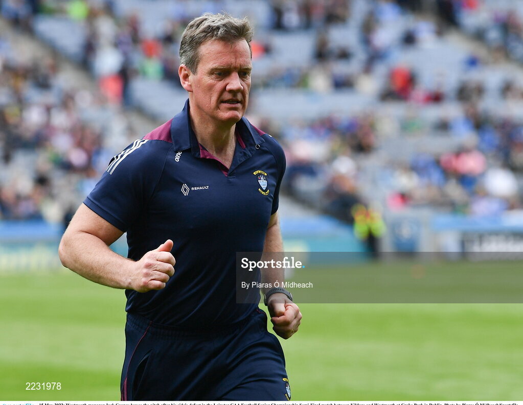 15 May 2022; Westmeath manager Jack Cooney leaves the pitch after his side's defeat in the Leinster GAA Football Senior Championship Semi-Final match between Kildare and Westmeath at Croke Park in Dublin. Photo by Piaras Ó Mídheach/Sportsfile