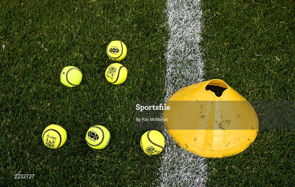 14 May 2022; Sliotars and a cone on the pitch the Leinster GAA Hurling Senior Championship Round 4 match between Laois and Galway at MW Hire O’Moore Park in Portlaoise, Laois. Photo by Ray McManus/Sportsfile