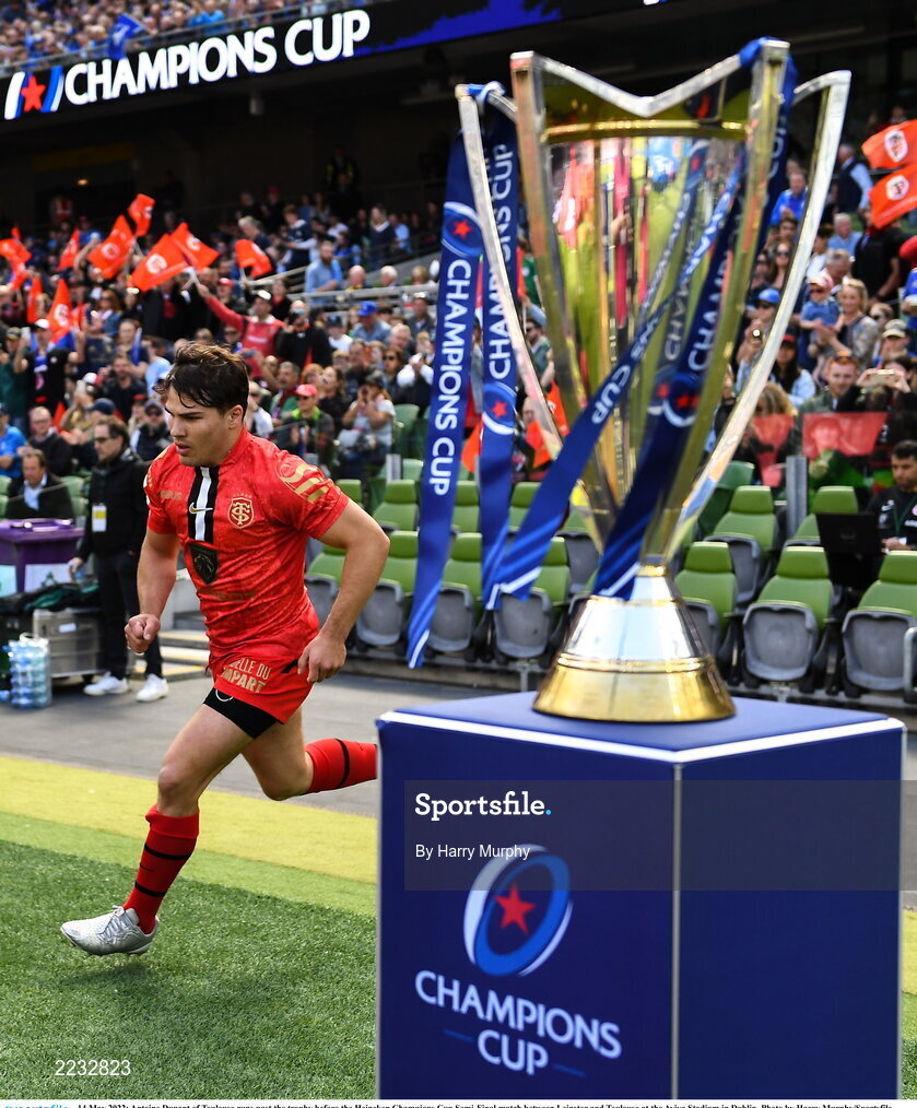 14 May 2022; Antoine Dupont of Toulouse runs past the trophy before the Heineken Champions Cup Semi-Final match between Leinster and Toulouse at the Aviva Stadium in Dublin. Photo by Harry Murphy/Sportsfile