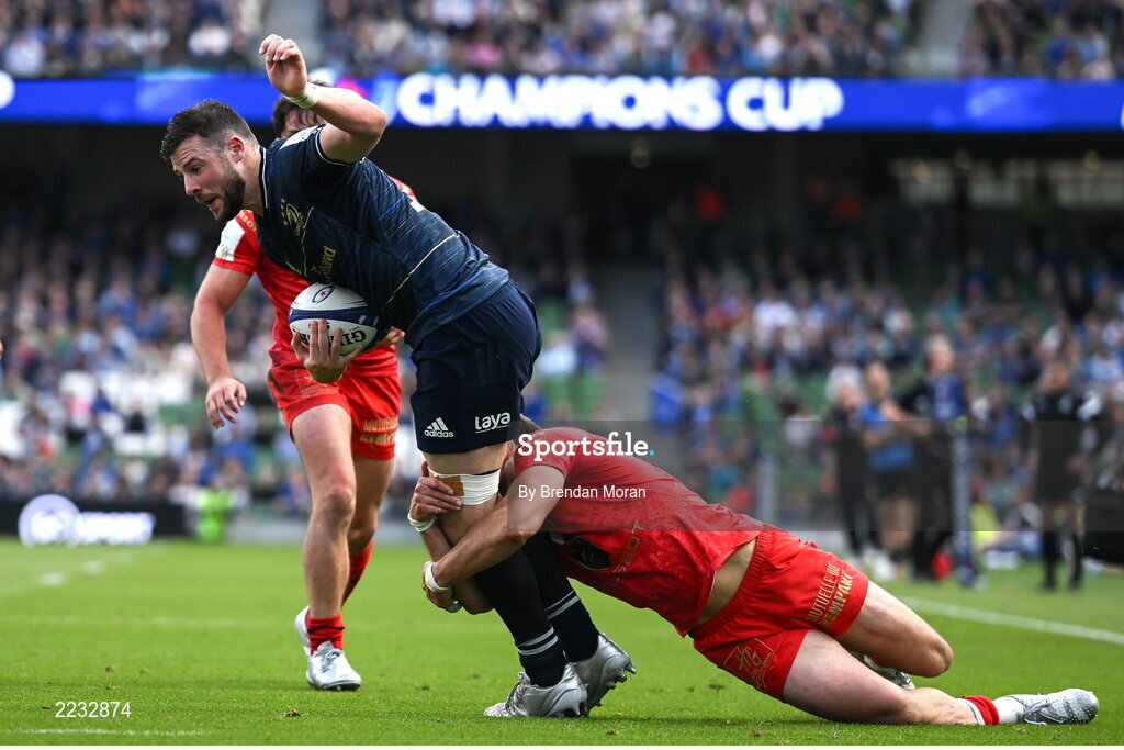 14 May 2022; Robbie Henshaw of Leinster is tackled by Juan Cruz Mallia of Toulouse during the Heineken Champions Cup Semi-Final match between Leinster and Toulouse at Aviva Stadium in Dublin. Photo by Brendan Moran/Sportsfile