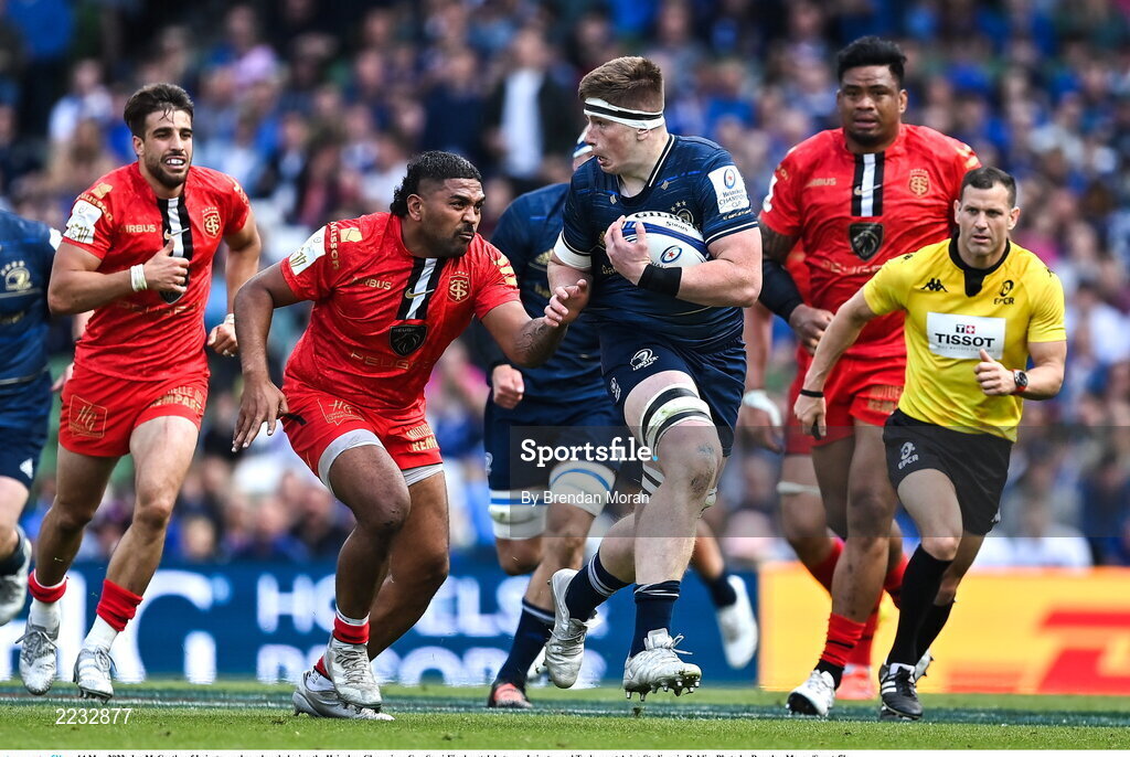 14 May 2022; Joe McCarthy of Leinster makes a break during the Heineken Champions Cup Semi-Final match between Leinster and Toulouse at Aviva Stadium in Dublin. Photo by Brendan Moran/Sportsfile