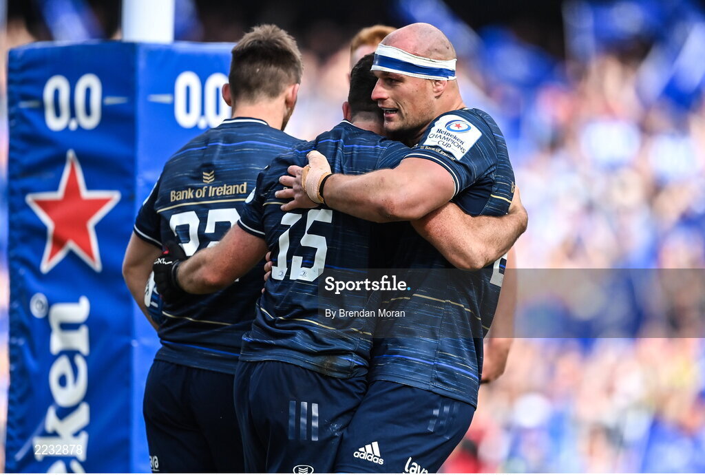 14 May 2022; Rhys Ruddock of Leinster, right, congratulated teammate Hugo Keenan on scoring their side's fourth try during the Heineken Champions Cup Semi-Final match between Leinster and Toulouse at Aviva Stadium in Dublin. Photo by Brendan Moran/Sportsfile