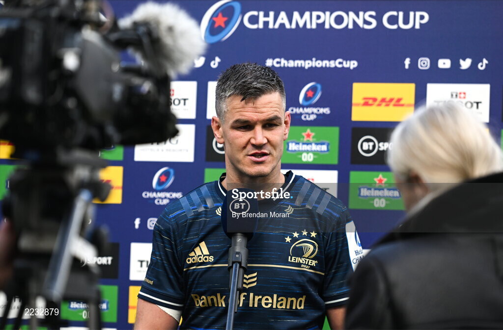 14 May 2022; Leinster captain Jonathan Sexton is interviewed by BT Sport after the Heineken Champions Cup Semi-Final match between Leinster and Toulouse at Aviva Stadium in Dublin. Photo by Brendan Moran/Sportsfile