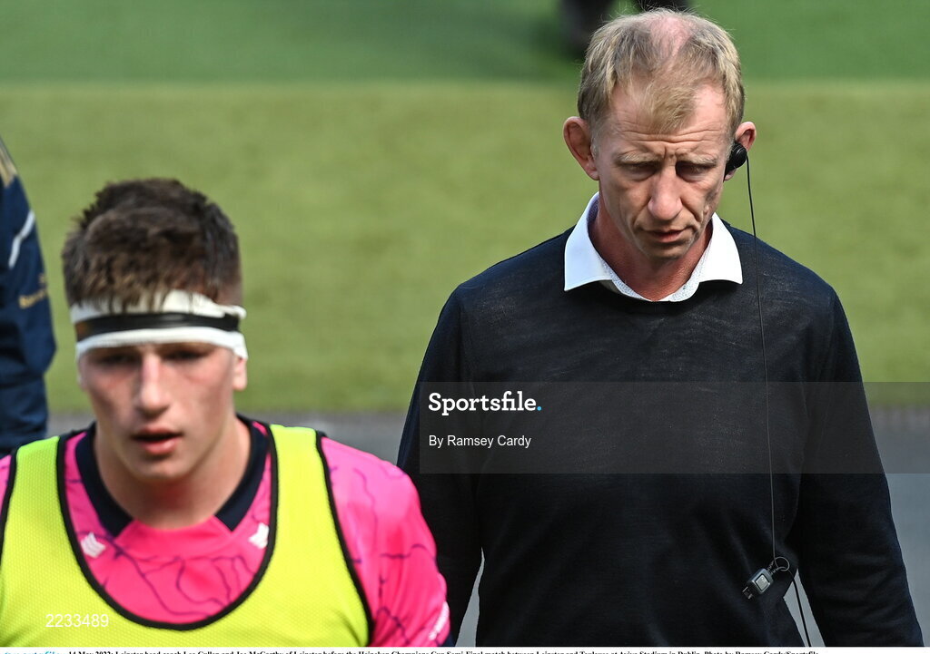 14 May 2022; Leinster head coach Leo Cullen and Joe McCarthy of Leinster before the Heineken Champions Cup Semi-Final match between Leinster and Toulouse at Aviva Stadium in Dublin. Photo by Ramsey Cardy/Sportsfile