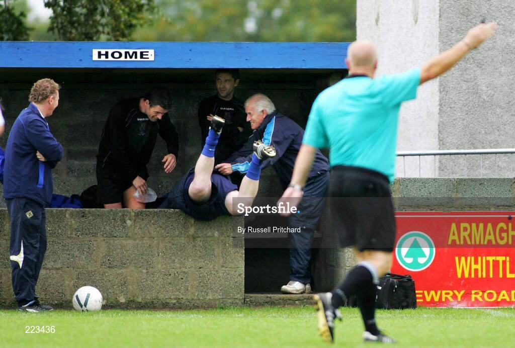 23 September 2006; Armagh City's manager Gary McKinstry gets knocked into the dugout by a football kicked in his direction while Referee Frankie Hiles signals to stop play Carnegie Premier League, Armagh City v Glentoran, Holm Park, Armagh, Co. Armagh. Picture credit: Russell Pritchard / SPORTSFILE