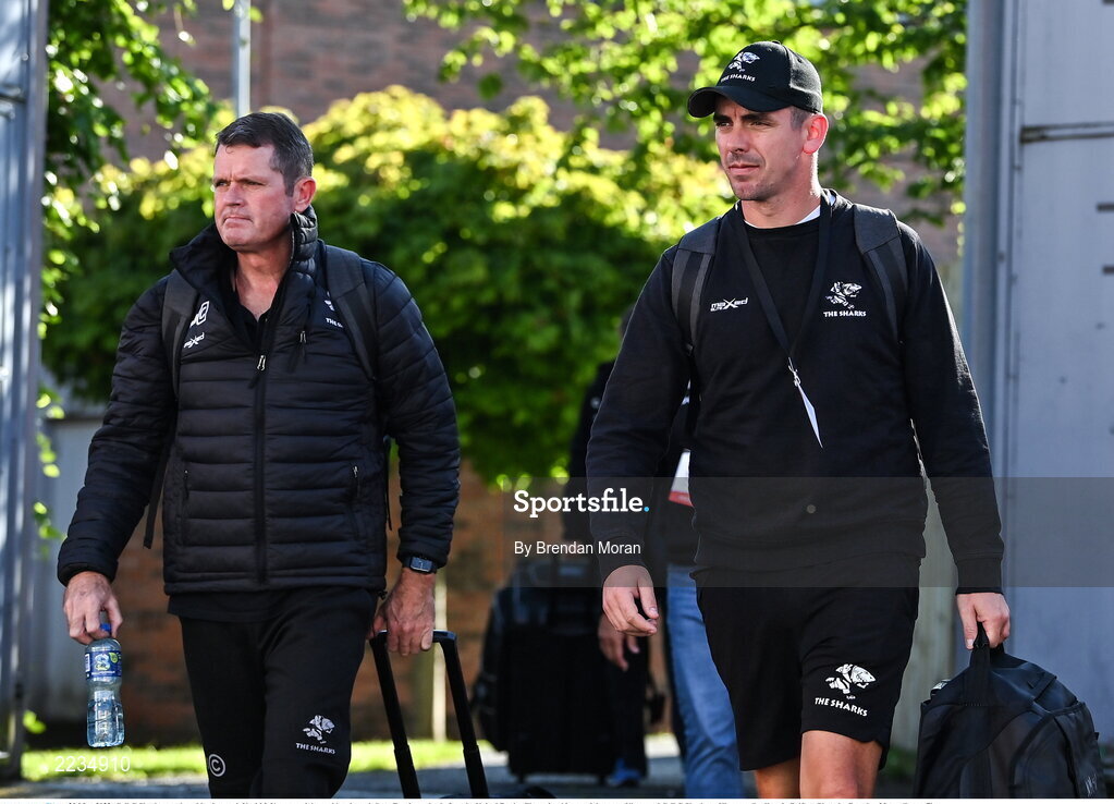 20 May 2022; Cell C Sharks attack and backs coach Noel McNamara, right, and head coach Sean Everitt arrive before the United Rugby Championship match between Ulster and Cell C Sharks at Kingspan Stadium in Belfast. Photo by Brendan Moran/Sportsfile