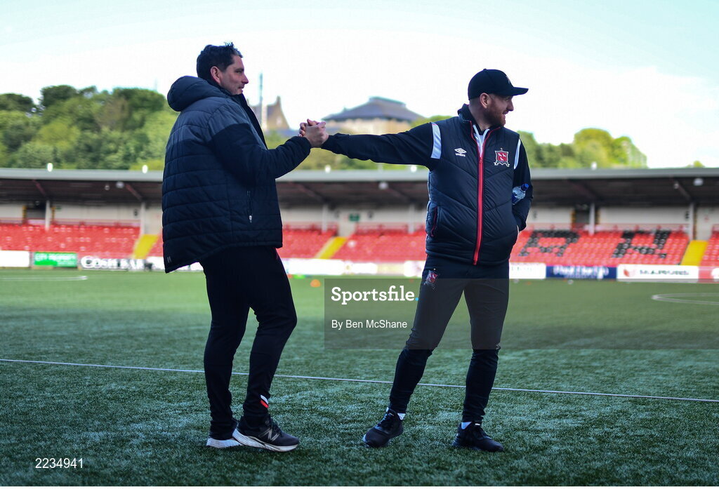 20 May 2022; Derry City manager Ruaidhrí Higgins, left, and Dundalk head coach Stephen O'Donnell before the SSE Airtricity League Premier Division match between Derry City and Dundalk at The Ryan McBride Brandywell Stadium in Derry. Photo by Ben McShane/Sportsfile