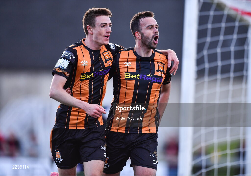 20 May 2022; Robbie Benson of Dundalk celebrates with teammate Daniel Kelly, left, after scoring his side's first goal during the SSE Airtricity League Premier Division match between Derry City and Dundalk at The Ryan McBride Brandywell Stadium in Derry. Photo by Ben McShane/Sportsfile