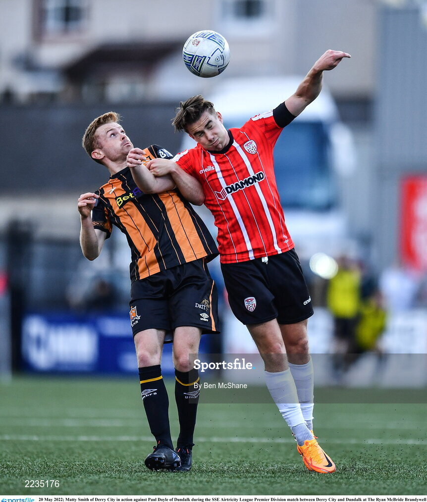 20 May 2022; Matty Smith of Derry City in action against Paul Doyle of Dundalk during the SSE Airtricity League Premier Division match between Derry City and Dundalk at The Ryan McBride Brandywell Stadium in Derry. Photo by Ben McShane/Sportsfile