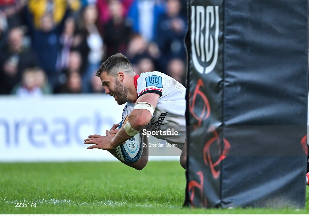 20 May 2022; Stuart McCloskey of Ulster scores his side's second try during the United Rugby Championship match between Ulster and Cell C Sharks at Kingspan Stadium in Belfast. Photo by Brendan Moran/Sportsfile