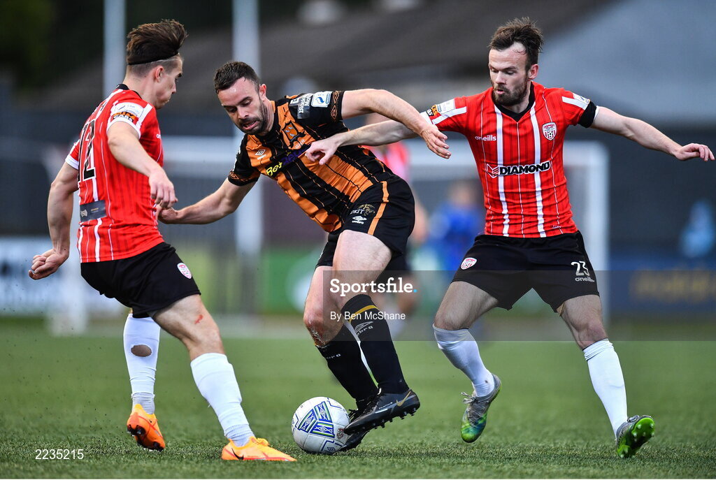 20 May 2022; Robbie Benson of Dundalk in action against Cameron Dummigan, right, and Matty Smith of Derry City during the SSE Airtricity League Premier Division match between Derry City and Dundalk at The Ryan McBride Brandywell Stadium in Derry. Photo by Ben McShane/Sportsfile