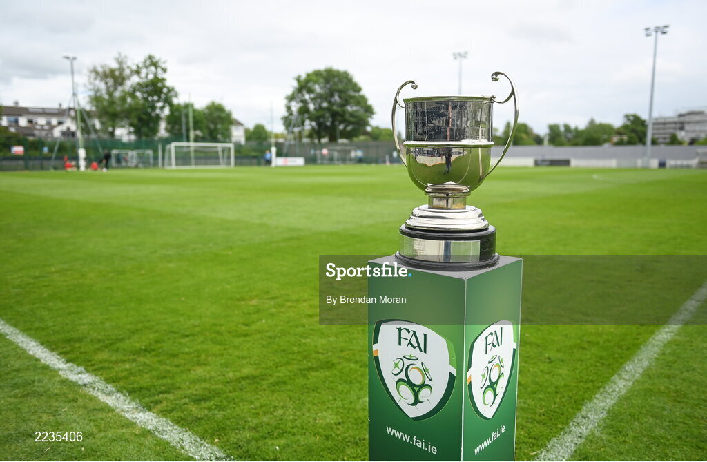 21 May 2022; The Johnny Giles Spots Challenge trophy before the FAI Centenary Under 17 Cup Final 2021/2022 match between Corduff FC and College Corinthians at Home Farm Football Club in Dublin. Photo by Brendan Moran/Sportsfile