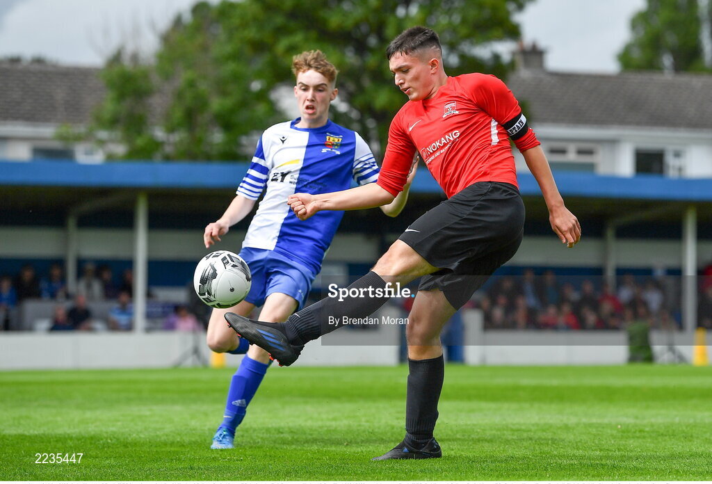 21 May 2022; Luke Kearns of Corduff FC in action against David Healy of College Corinthians AFC during the FAI Centenary Under 17 Cup Final 2021/2022 match between Corduff FC, Dublin, and College Corinthians AFC, Cork, at Home Farm Football Club in Dublin. Photo by Brendan Moran/Sportsfile