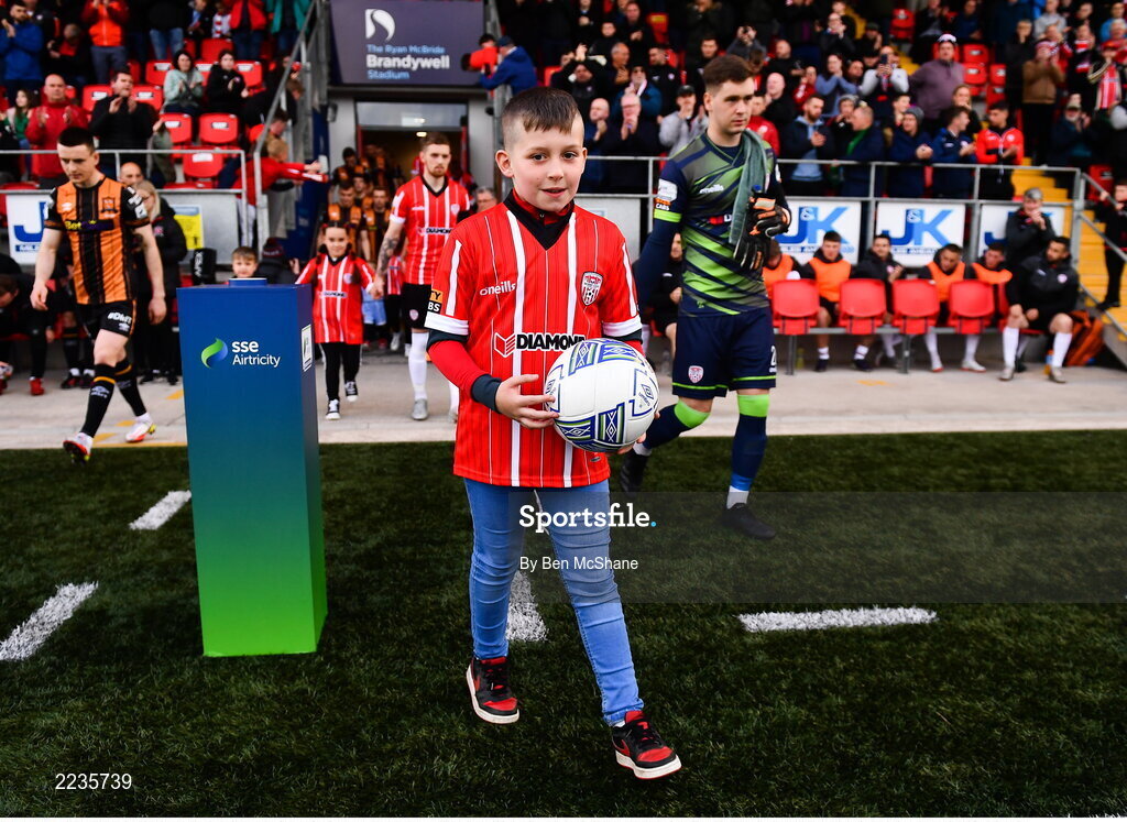 20 May 2022; Jamie McCormick, son of late Derry City supporter Edgar McCormick, takes the match ball from the plinth before the SSE Airtricity League Premier Division match between Derry City and Dundalk at The Ryan McBride Brandywell Stadium in Derry. Photo by Ben McShane/Sportsfile