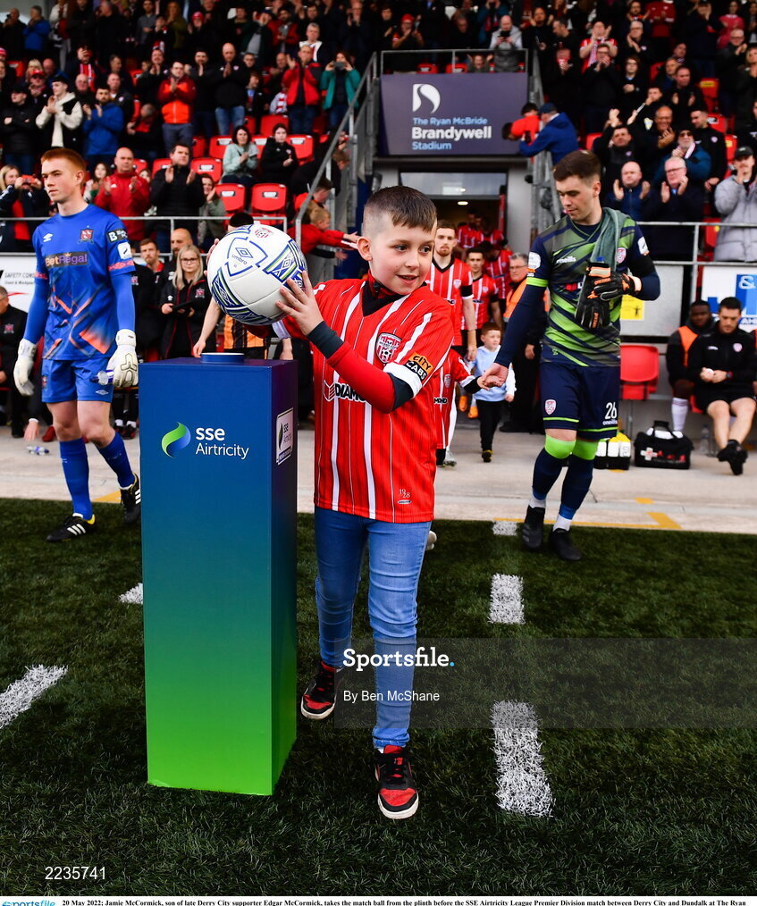 20 May 2022; Jamie McCormick, son of late Derry City supporter Edgar McCormick, takes the match ball from the plinth before the SSE Airtricity League Premier Division match between Derry City and Dundalk at The Ryan McBride Brandywell Stadium in Derry. Photo by Ben McShane/Sportsfile