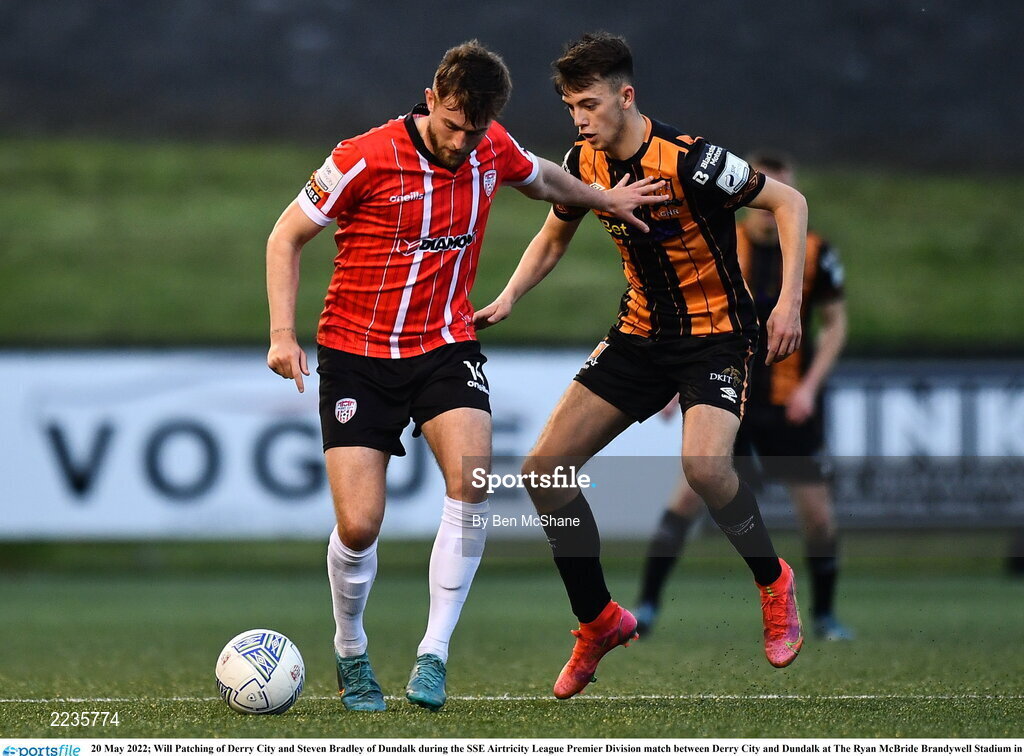 20 May 2022; Will Patching of Derry City and Steven Bradley of Dundalk during the SSE Airtricity League Premier Division match between Derry City and Dundalk at The Ryan McBride Brandywell Stadium in Derry. Photo by Ben McShane/Sportsfile