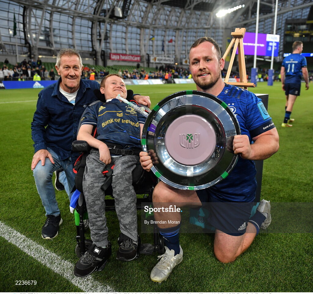 21 May 2022; Leinster captain Ed Byrne with the Irish Shield and Leinster supporters Alan and Matthew McGrath after the United Rugby Championship match between Leinster and Munster at Aviva Stadium in Dublin. Photo by Brendan Moran/Sportsfile