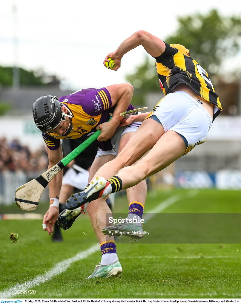 21 May 2022; Conor McDonald of Wexford and Richie Reid of Kilkenny during the Leinster GAA Hurling Senior Championship Round 5 match between Kilkenny and Wexford at UPMC Nowlan Park in Kilkenny. Photo by Stephen McCarthy/Sportsfile