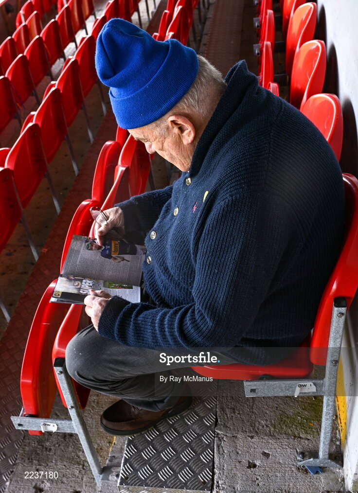 22 May 2022; An early arrival reads his programme before the Munster GAA Hurling Senior Championship Round 5 match between Clare and Waterford at Cusack Park in Ennis, Clare. Photo by Ray McManus/Sportsfile