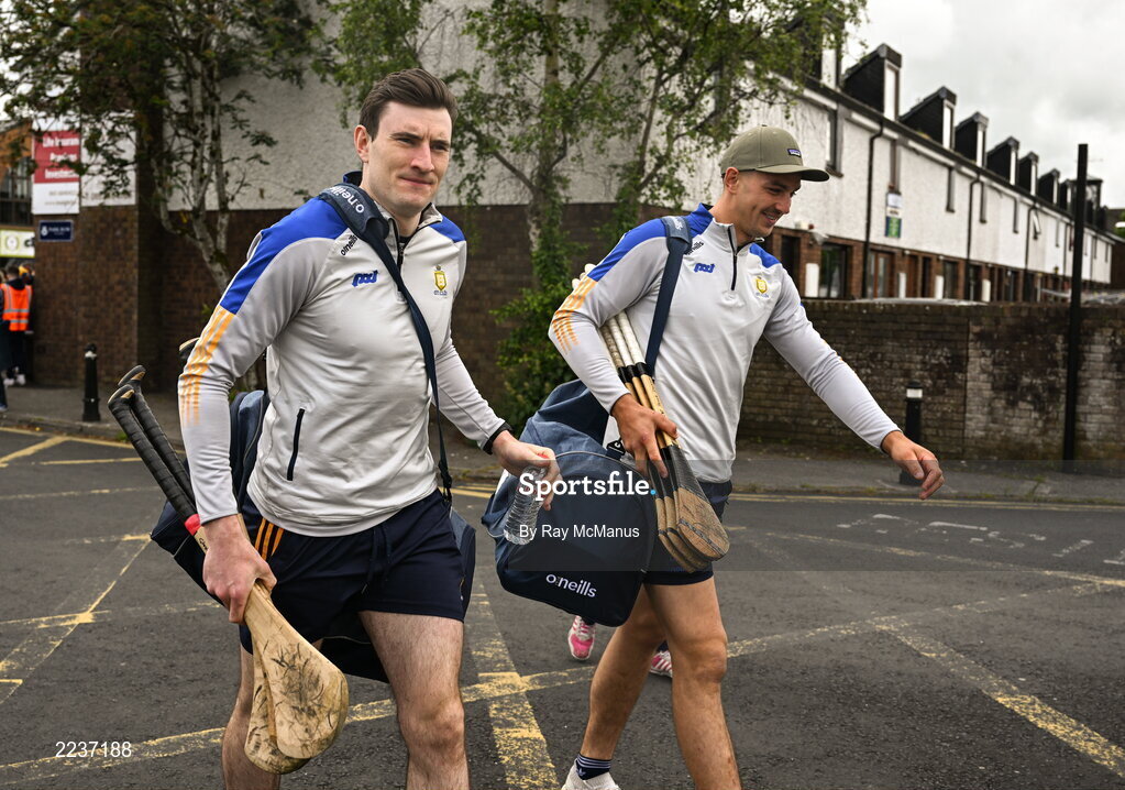22 May 2022; Clare players David Fitzgerald, left, and Peter Duggan arrive for the Munster GAA Hurling Senior Championship Round 5 match between Clare and Waterford at Cusack Park in Ennis, Clare. Photo by Ray McManus/Sportsfile