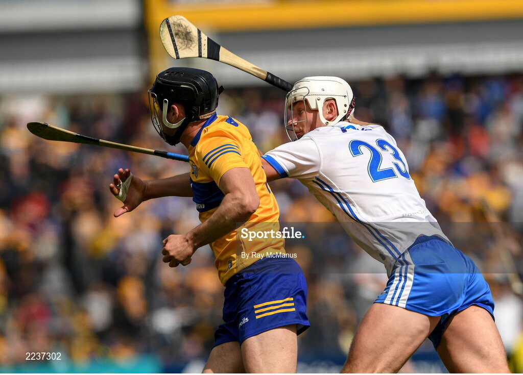 22 May 2022; Jack Browne of Clare is tackled by Neil Montgomery of Waterford during the Munster GAA Hurling Senior Championship Round 5 match between Clare and Waterford at Cusack Park in Ennis, Clare. Photo by Ray McManus/Sportsfile