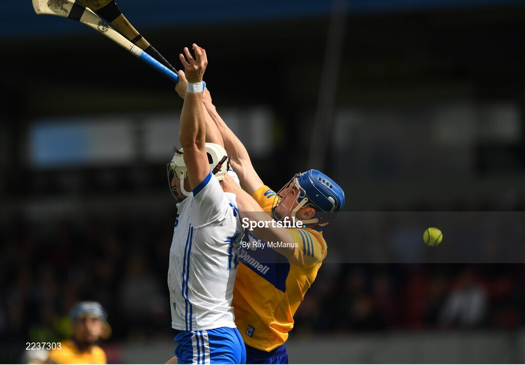 22 May 2022; Michael Kiely of Waterford is tackled by Rory Hayes of Clare during the Munster GAA Hurling Senior Championship Round 5 match between Clare and Waterford at Cusack Park in Ennis, Clare. Photo by Ray McManus/Sportsfile